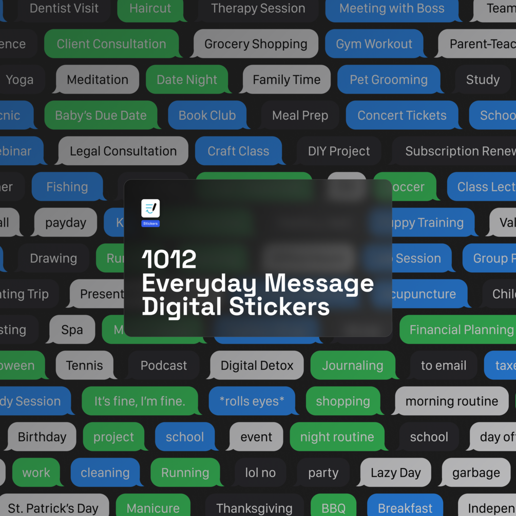 Introducing Everyday Message Digital Stickers! Enjoy 1012 total everyday labels in the classic iMessage Textbubble Style in blue, green, grey and darkgrey (253 per color). These minimal stickers are perfect for GoodNotes Elements calendar and other digital planner or journals.